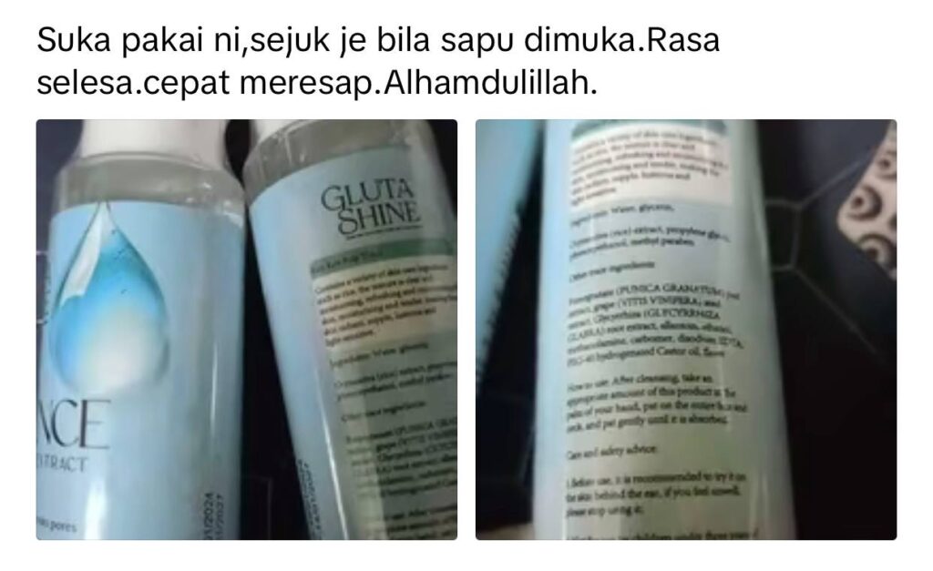 Ada 4 fungsi Gluta Shine iaitu Serum, Toner, Esen dan Moisturiser. Semua ni ‘All in 1 Set’ tauu.